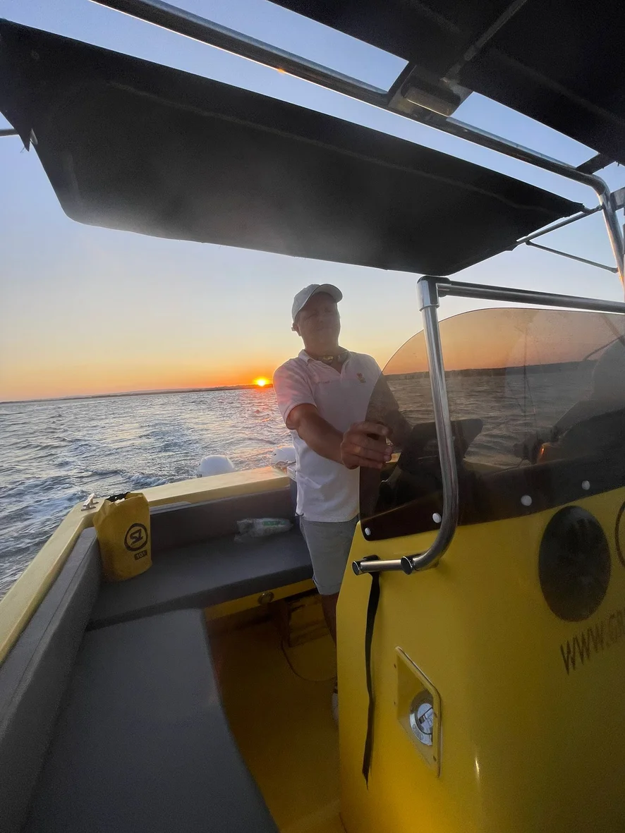 Dejando caer el Sol por la popa mientras navego a puerto base.